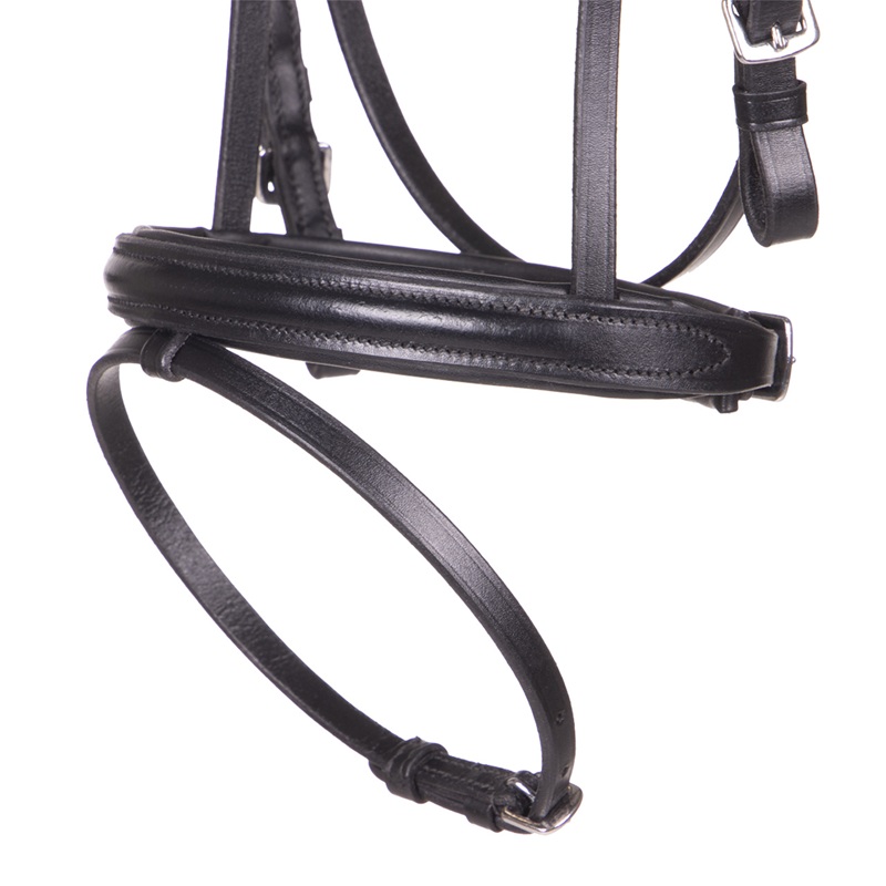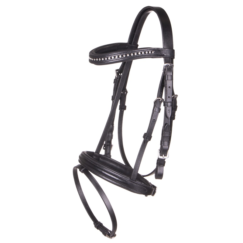 Stilvoller Zaum aus Leder für kleine Größen. Ausgestattet mit einem leicht geschwungenen Stirnband mit kleinen, dezenten Strasssteinen. Geliefert mit Gurtzügeln.